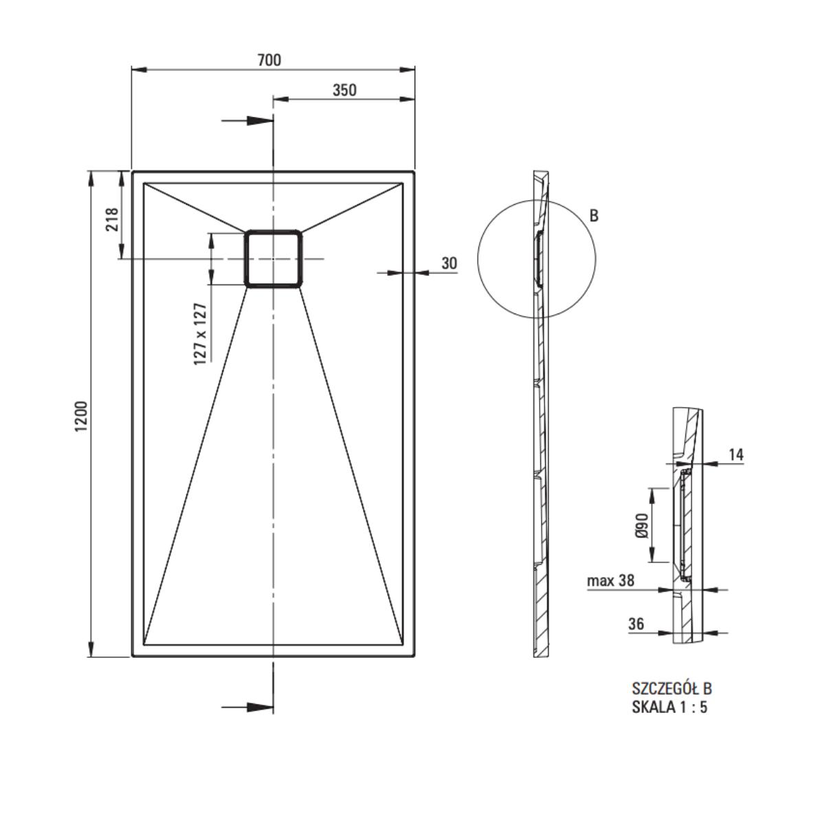 Mõõtmed: 1200 x 700 x 36 mm (laius x pikkus x sügavus).