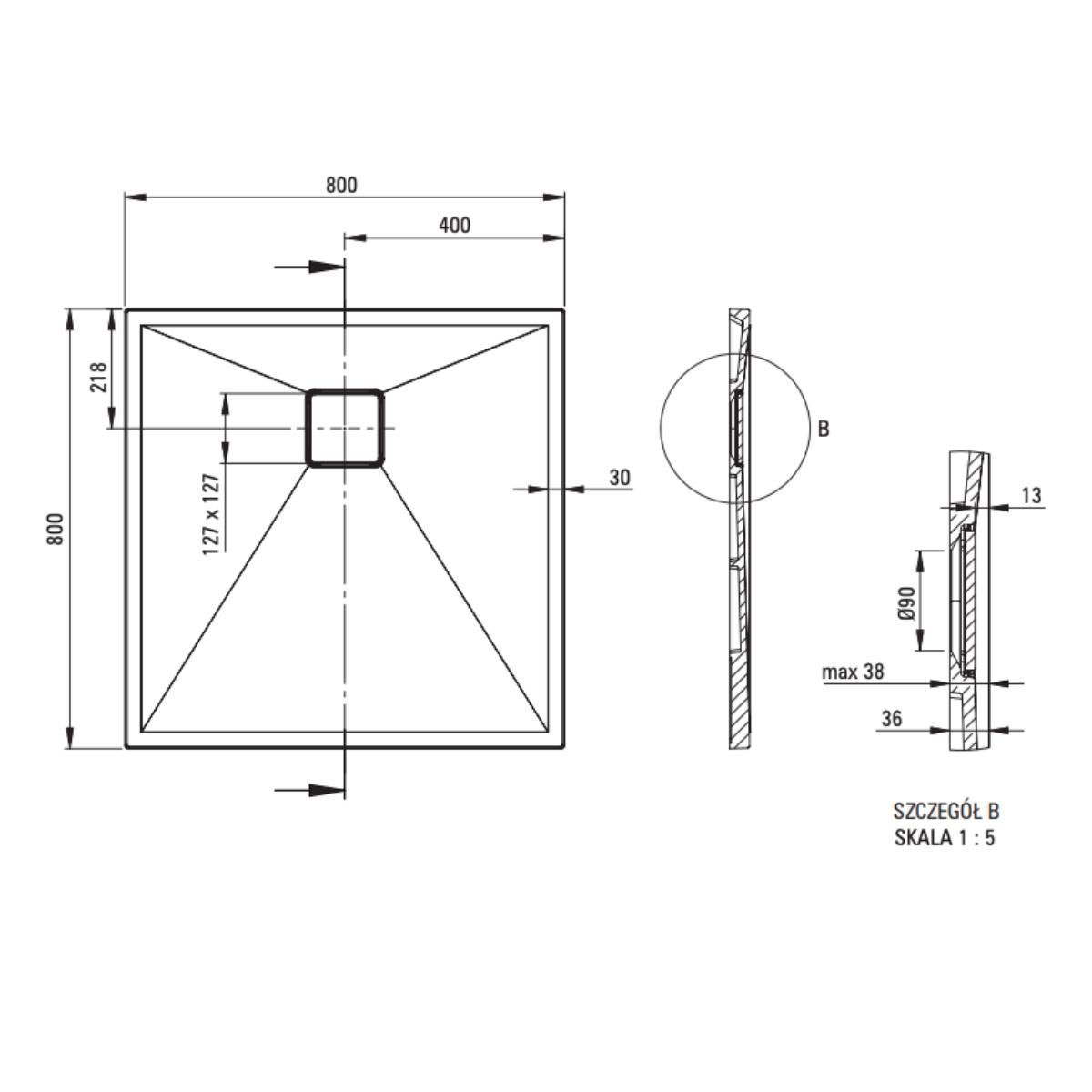 Mõõtmed: 800 x 800 x 36 mm (laius x pikkus x sügavus).