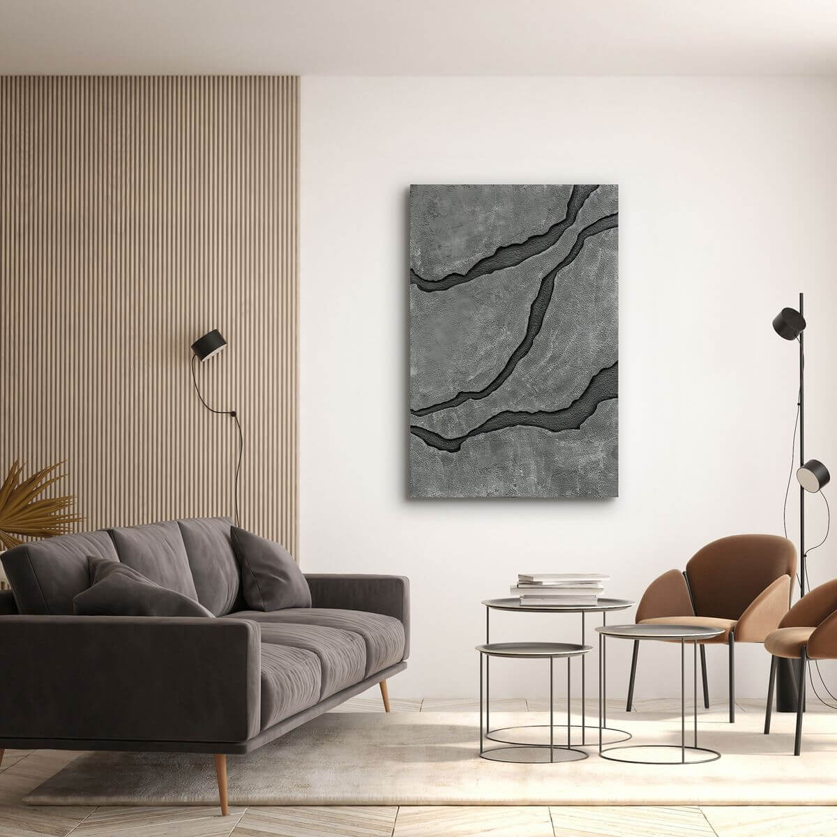 Käsitöö tekstuurmaal Slate I on jõuline seinakunst, mis imiteerib betooni ja kivi struktuuri. See teos on valminud käsitööna, kasutades spetsiaalset reljeefset krohvitehnikat, mis tõstab maali pinna lõuendist kõrgemale, luues põneva varjude mängu.