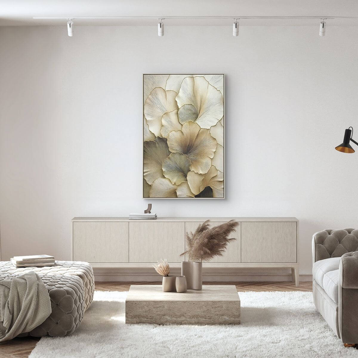 Käsitööviimistlusega seinapilt Petals on suuremõõtmeline botaaniline seinapilt, kus kohtuvad kvaliteetne trükk ja käsitööna lisatud 3D-tekstuur. Soojad beežid toonid ja kuldsed aktsendid loovad ruumis harmoonilise ja luksusliku atmosfääri. Tänu tekstuurile muutub pilt elavaks vastavalt sellele, kuidas valgus ruumis langeb.