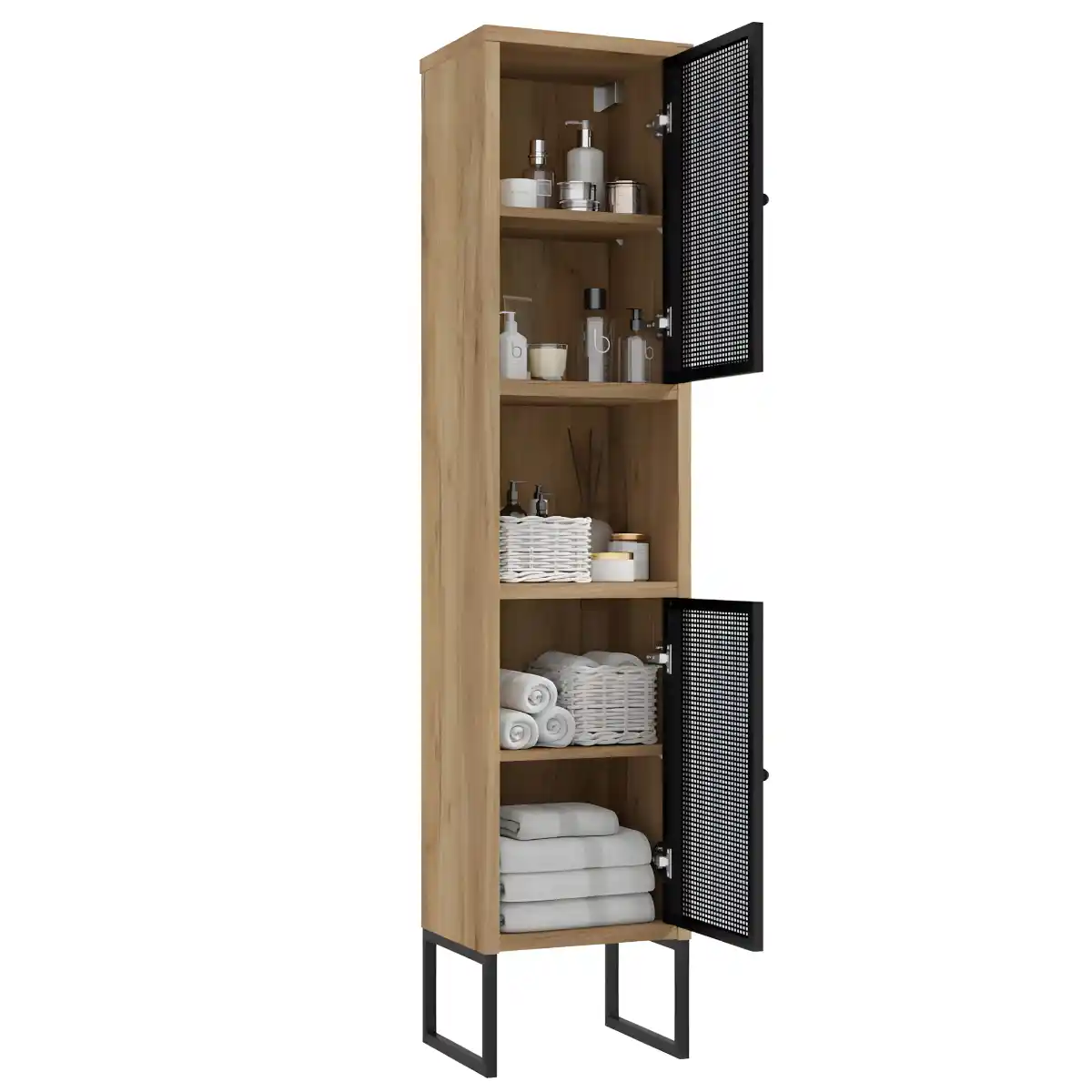 Toob vannituppa industriaalse metalli ja monokroomse musta kombinatsiooni. Perforeeritud metallesipaneelid lisavad karakterit ja tagavad head ventilatsiooni, Soft Close hoiab sulgumise vaiksena. Geomeetrilised metalljalad tõstavad kapi põrandast – koristamine on lihtsam ja mööbel näib visuaalselt kergem. 30 cm lai, 170 cm kõrge, 38 cm sügav formaat pakub arvestatavat panipaika ka kompaktsetes vannitubades.