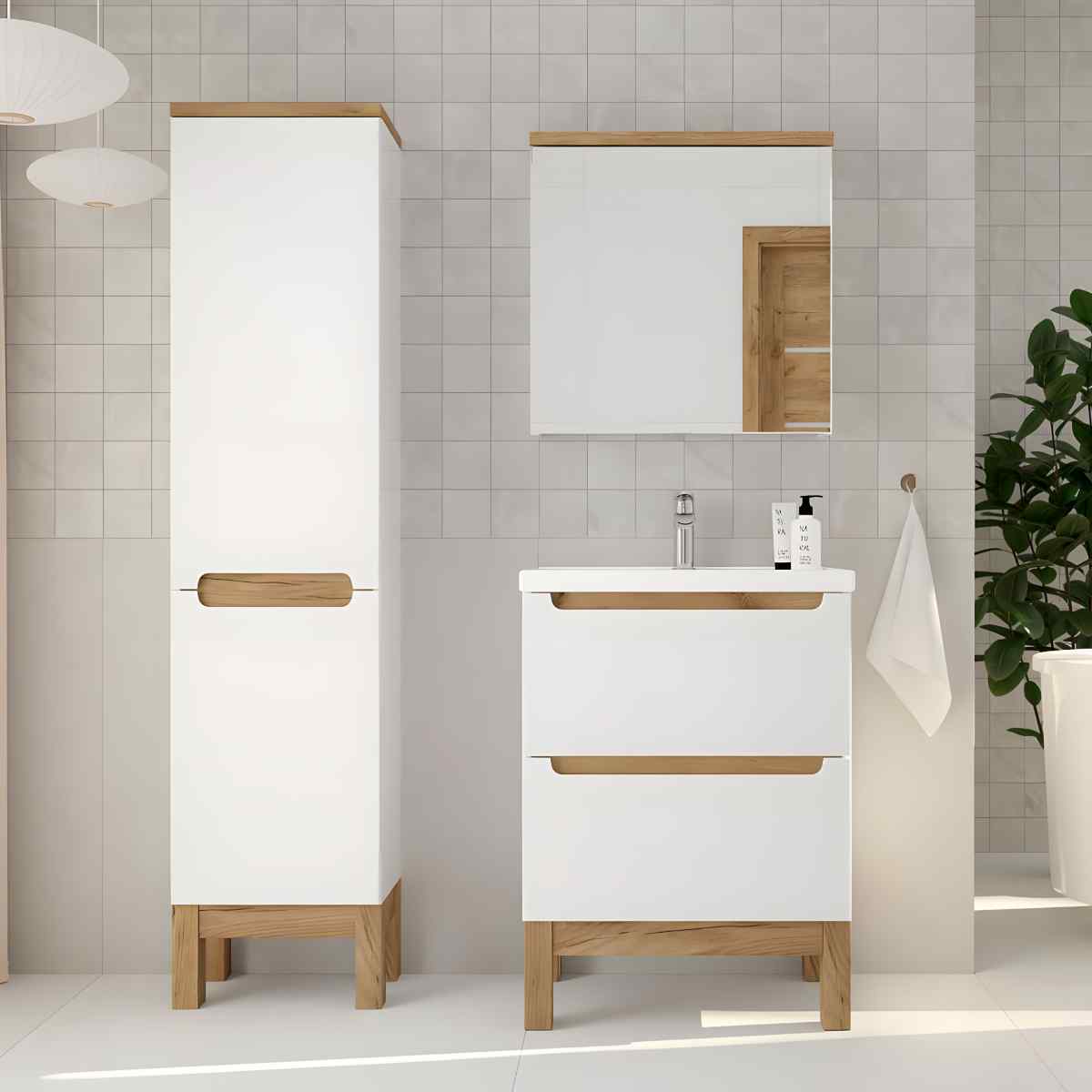 Lahendab rätikute, tualettpaberi ja kodukeemia ladustamise ühes kõrges, kuid visuaalselt puhtas korpuses. Freesitud käepide hoiab fassaadi joone katkestusteta ning on käele mugav. Soft Close vähendab müra ja kulumist igapäevases kasutuses, kuldtamme toonis jalad lisavad valgele kõrgläikele sooja aktsendi.