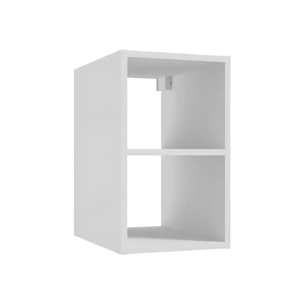 Avatud seinakuubik, mis lisab vannituppa nähtava hoiuruumi ning sobib hästi kompositsioonidesse 45 cm sügavusega tasapinna aluste või valamukappide kõrvale. Tänu ~43,5 cm sügavusele sulandub see proportsioonilt teiste moodulitega ning aitab katta seinaosasid, kuhu suletud kapp ei sobi.