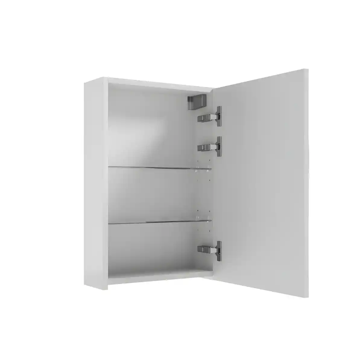 SALSA E40 on kompaktne 40 cm lai seinale kinnitatav peeglikapp ühe pööratava uksega (vasak/parem). Mõõdud: 40 × 60 × 15 cm (L × K × S). Ukse taga on kaks kõrguses reguleeritavat klaasriiulit, mis hoiavad esmatarbed tolmuvabalt. Uks sulgub Soft Close-hingedel; riputid on reguleeritavad lihtsaks paigalduseks.