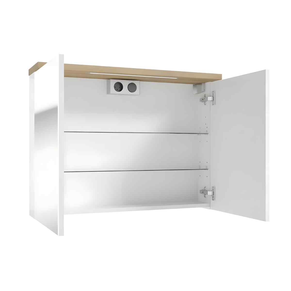 ühendab peegli, integreeritud valgusti ja suletud panipaiga ühte korpusesse. LED-valgus teeb meikimise ja habemeajamise mugavaks, klaasriiulid hoiavad hügieenitarbed nähtavalt ja korras. 20 cm sügavus lisab mahutavust võrreldes 15 cm variandiga, jäädes siiski kompaktseks 80 cm laiuse kompositsiooni jaoks.