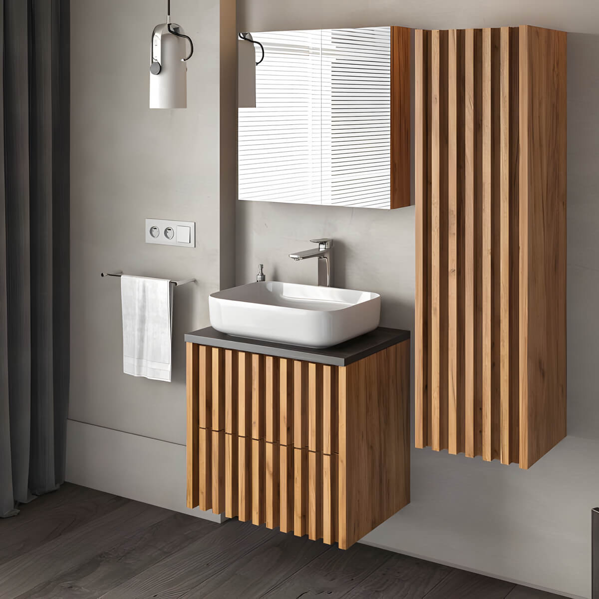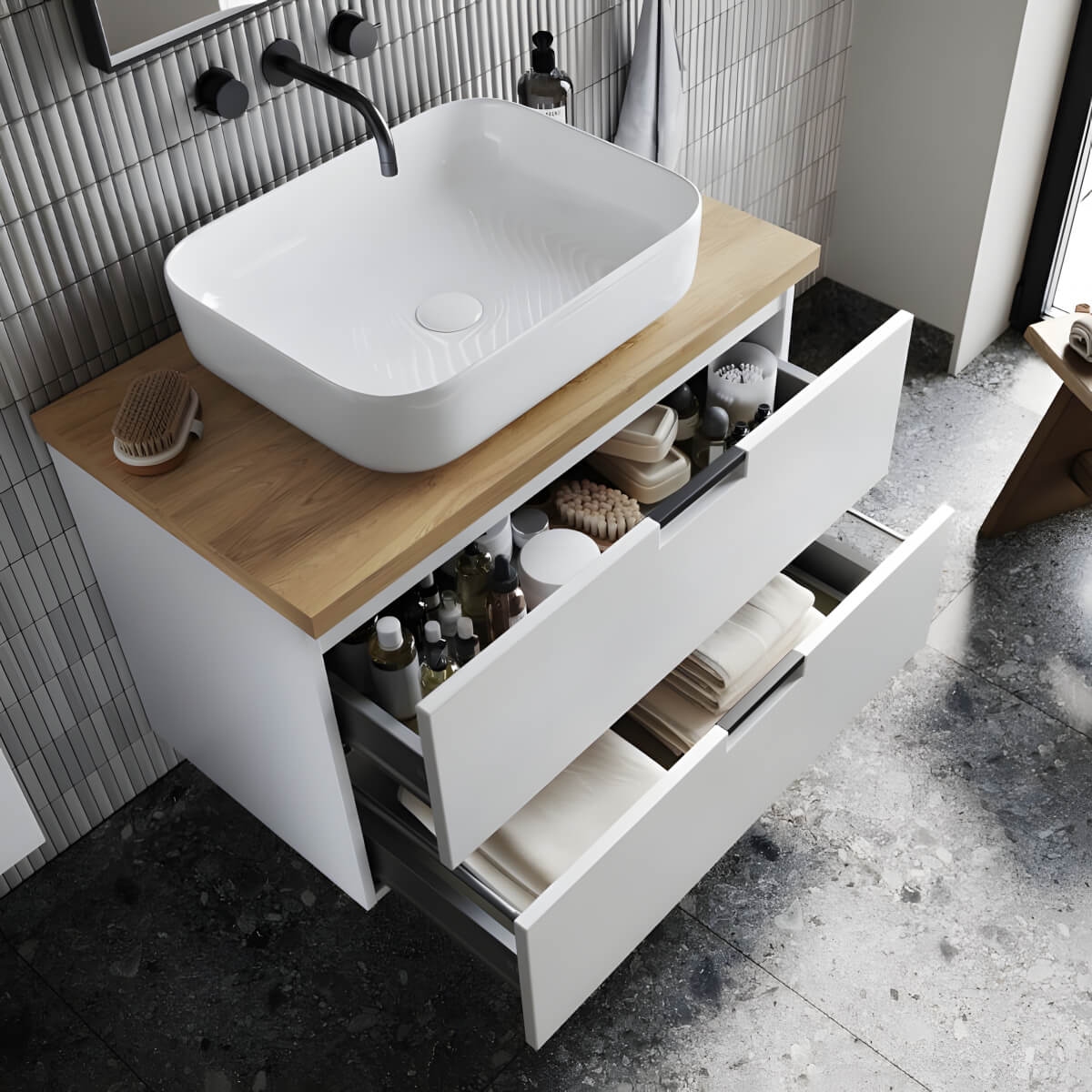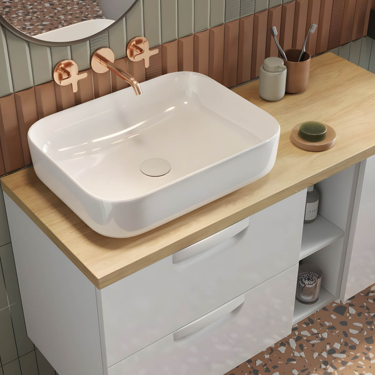 Pinnapealne valamu Vieneto ühendab endas modernse disaini ja praktilisuse. Valamu puhtad jooned ja geomeetriline vorm loovad elegantse ilme, mis täiendab nii kaasaegseid kui ka klassikalisemaid vannitubasid. Valamu on valmistatud vastupidavast ja kergesti puhastatavast keraamikast, mis tagab pika kasutusea ja hügieenilisuse. Kuna valamule ei ole puuritud segistiava, saab seda kombineerida seinale või tööpinnale paigaldatava segistiga – see annab suurema vabaduse ja võimaluse luua just sinu vannituppa sobiv lahendus.