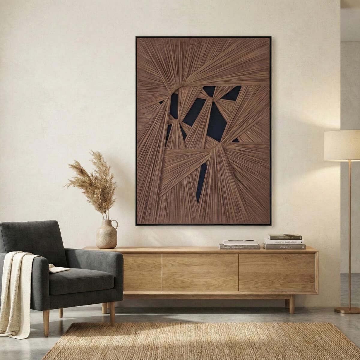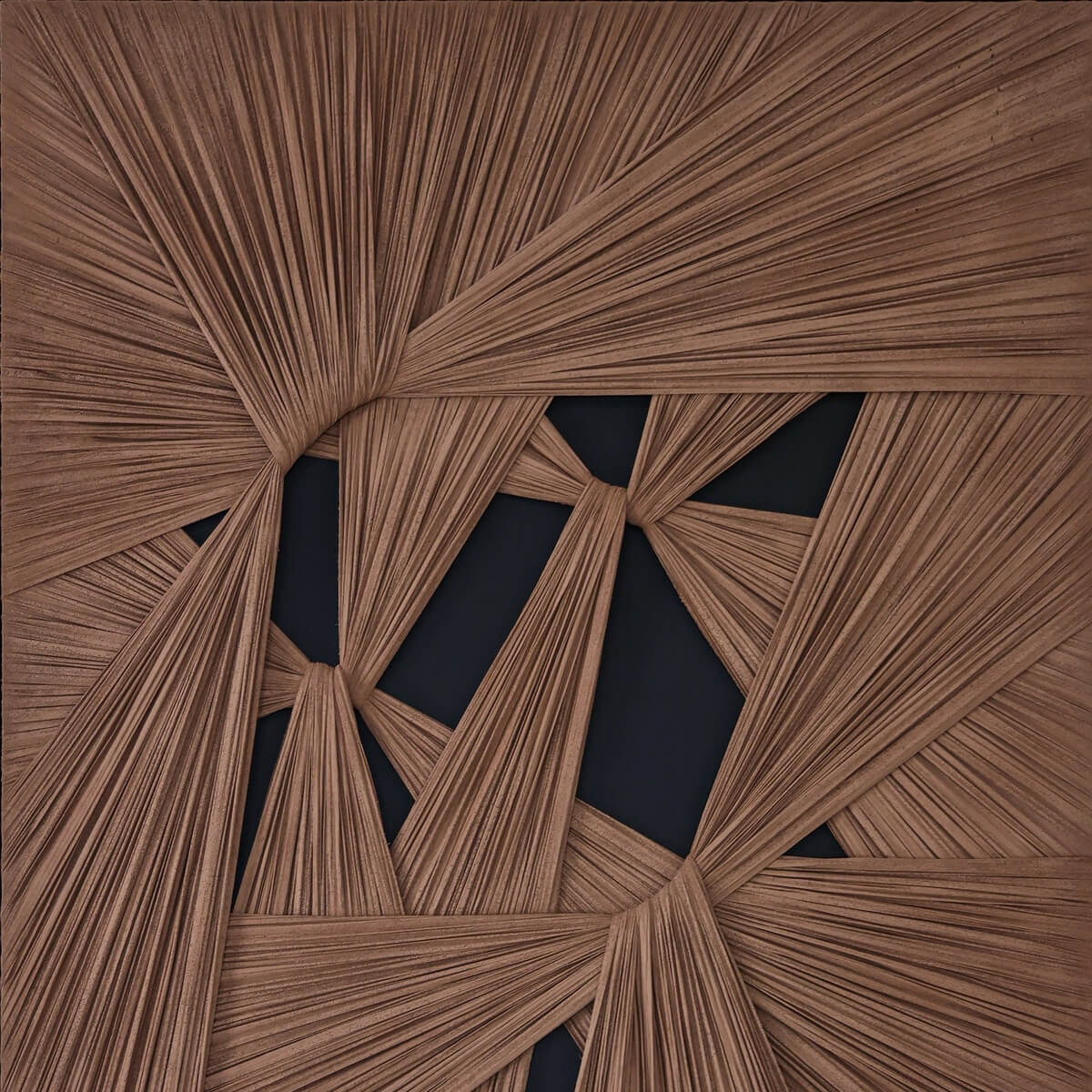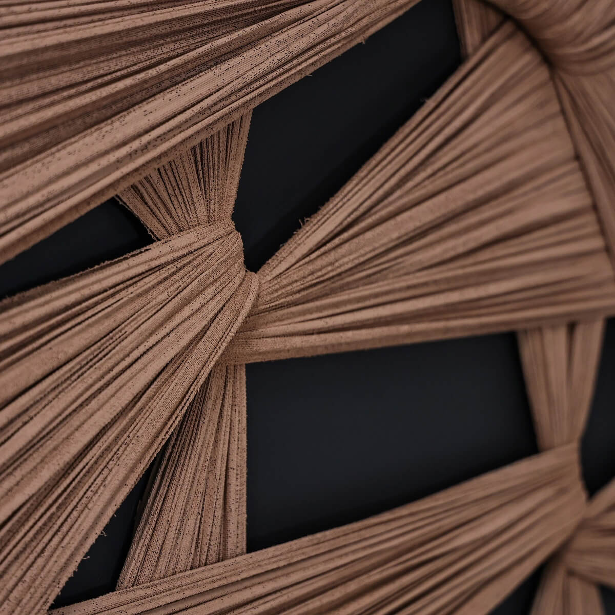 Põimunud kanga installatsioon Knot on suuremõõtmeline ja silmapaistev disainielement. Soe pruun toon kohtub sügava musta taustaga, luues elegantse kontrasti, mis sobib nii modernsesse kui ka boheemlaslikus stiilis ruumi.