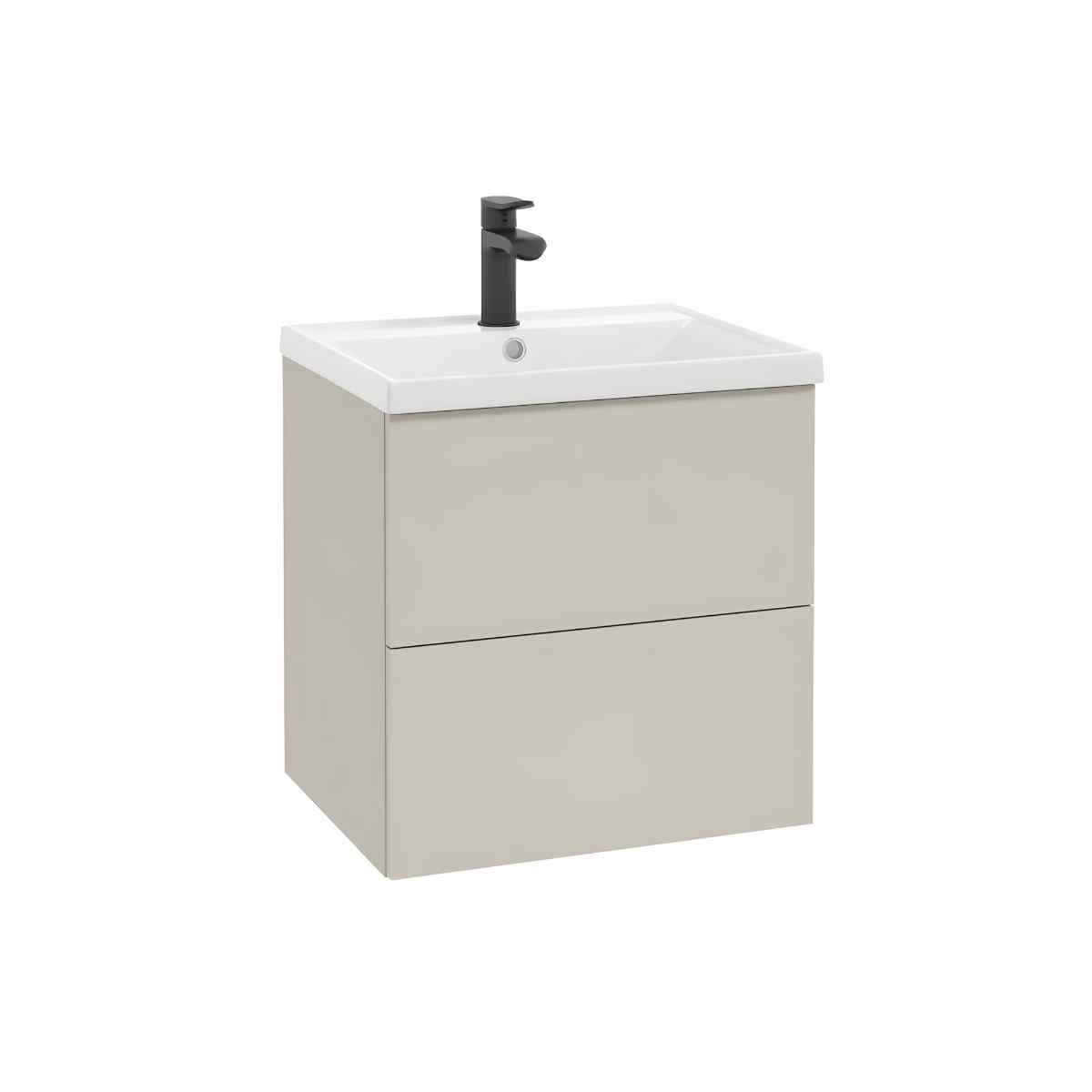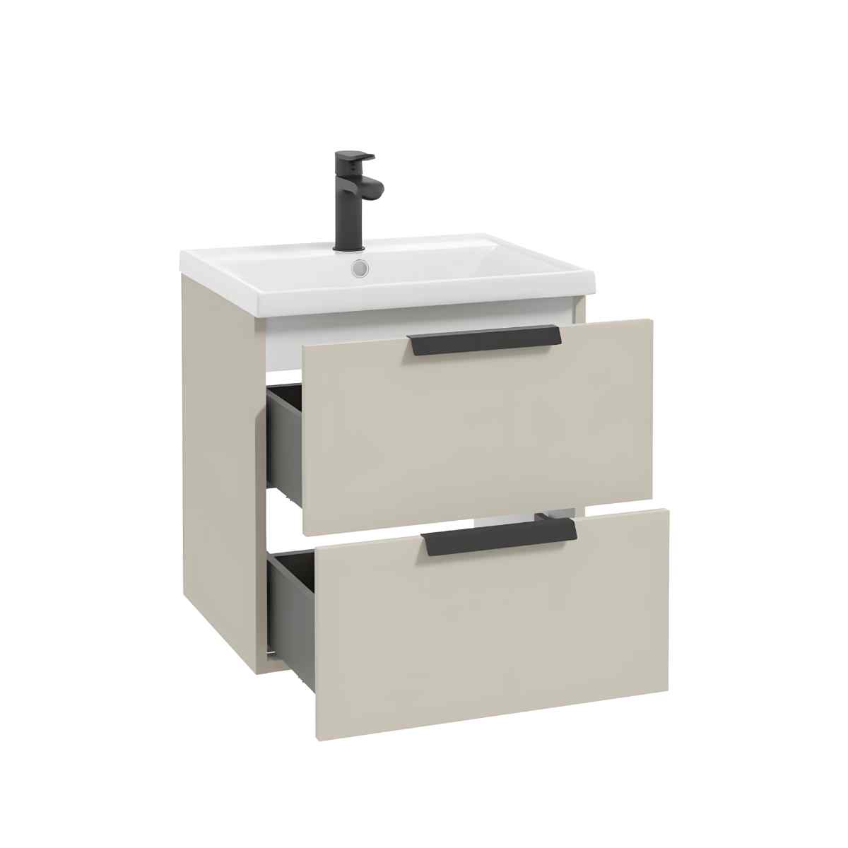 FARO D50 on seinale kinnitatav 50 cm valamukapp kahe sahtliga. Mõõdud: 50 × 50 × 40 cm. Tänu 40 cm sügavusele on kapp kompaktne; ei sobi tööpinna alla ega pealt paigaldatava valamuga. Mõlemal sahtlil on Soft Close-sulgurid, kapi riputid on reguleeritavad. Viimistlus: kašmiir matt. Käepidemed ei kuulu komplekti!