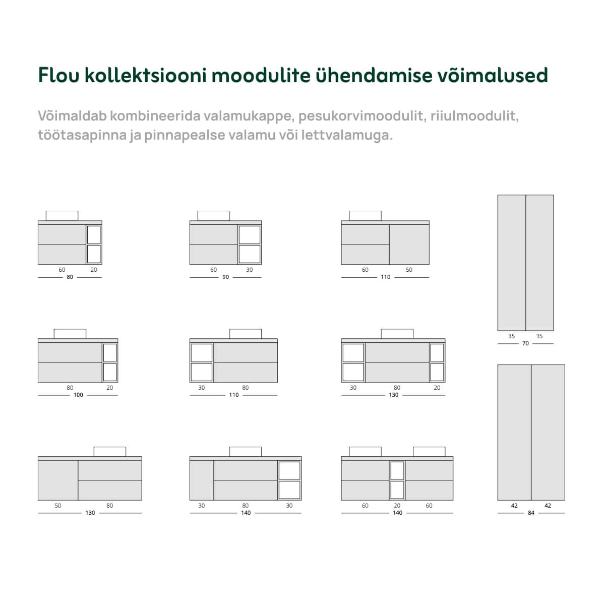 FLOU D100 on seinale kinnitatav kahe sahtliga valamukapp, mis ühendab minimalistliku joone ja nutika panipaiga. Mõõdud: 98 × 50 × 43,2 cm (L × K × S). Sahtlid liiguvad täisväljatõmbel ning on varustatud DefraSlim süsteemiga – õhemad metallküljed ja grafiithall täismetallkorpus annavad rohkem kasutuspinda; kandevõime kuni 35 kg. Ülasahtlis on DefraIn korraldaja. Soft Close tagab vaikse sulgumise, paigaldust lihtsustavad reguleeritavad riputid. Viimistlus: valge kõrgläige (front lakitud MDF, korpus lakitud lamineeritud plaat). Tarnitakse kokkupanduna.
