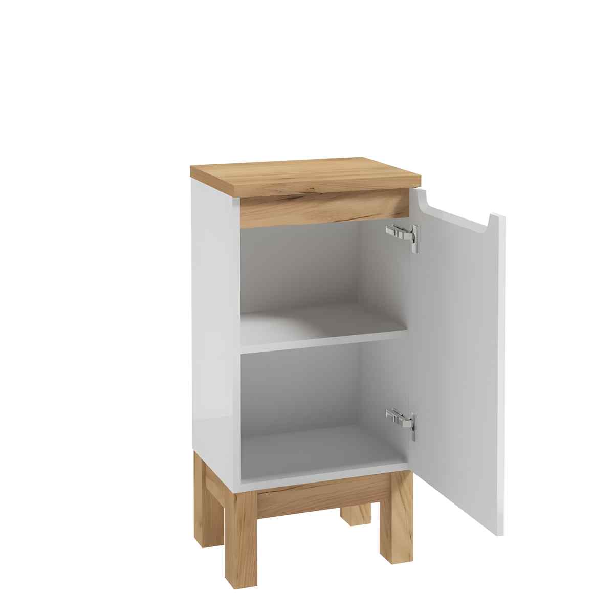 SPACE SYSTEM B40 on 40 cm lai tasapinnakapp ühe ukse ja sisemise riiuliga — nutikas lisamahutavus, mis sobib tööpinna alla või kõrvale. Mõõdud: 40 × 83 × 32 cm (L × K × S). Esipaneel on lakitud MDF, korpus lakitud lamineeritud plaadist, nii esiosad kui küljed on valge kõrgläikega. Uksel on Soft Close, käepide on integreeritud freeskäepide. Jalad on komplektis (toon golden oak).