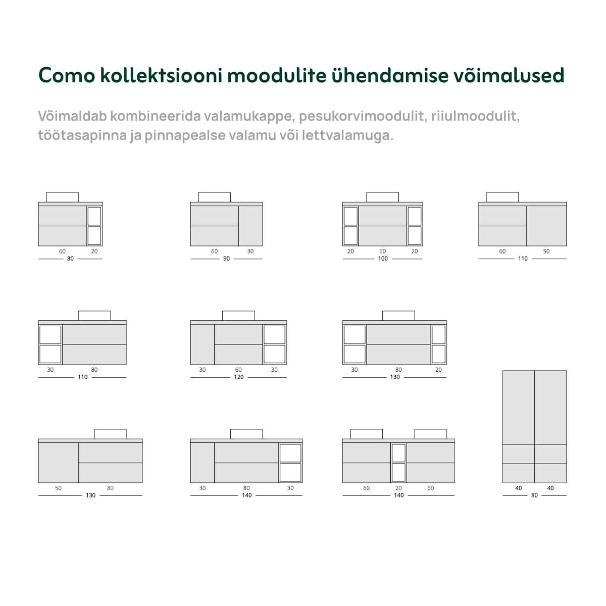 COMO D80 on seinale kinnitatav kahe sahtliga valamukapp, mis ühendab minimalistliku joone ja nutika panipaiga. Mõõdud: 79,9 × 50 × 45,1 cm (L × K × S). Sahtlid on DefraSlim süsteemiga (õhemad metallküljed ja täismetallist korpus grafiiditoonis), täisväljatõmbega siinidel ja DefraSoftClose pehme sulgumisega. Ülasahtlis on DefraIn korraldaja. 45° freesitud servad toimivad käepidemetena; paigaldust lihtsustavad reguleeritavad riputid.