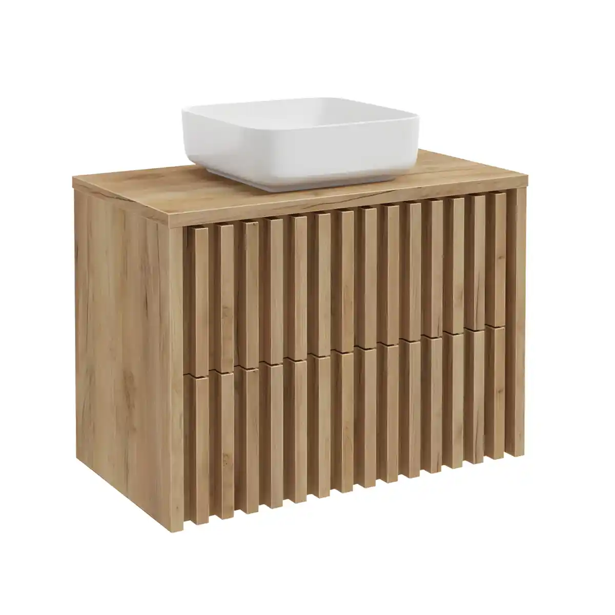 DELANO D80 on seinale kinnitatav valamukapp, mille iseloomulik liistudest (lamell-) esipaneel loob modernse, käepidemevaba ilme. Mõõdud: 80 × 56 × 45 cm (L × K × S). Sees 2 sügavat sahtlit täisväljatõmbel ja Soft Close sulgumisega, reguleeritavad riputid lihtsaks joondamiseks. Korpus ja esipaneelid on kuldtamme dekooriga lamineeritud plaadist. Võid kombineerida mööblivalamuga või tasapinna + pealtpaigaldatava valamuga (komponendid lisaks).