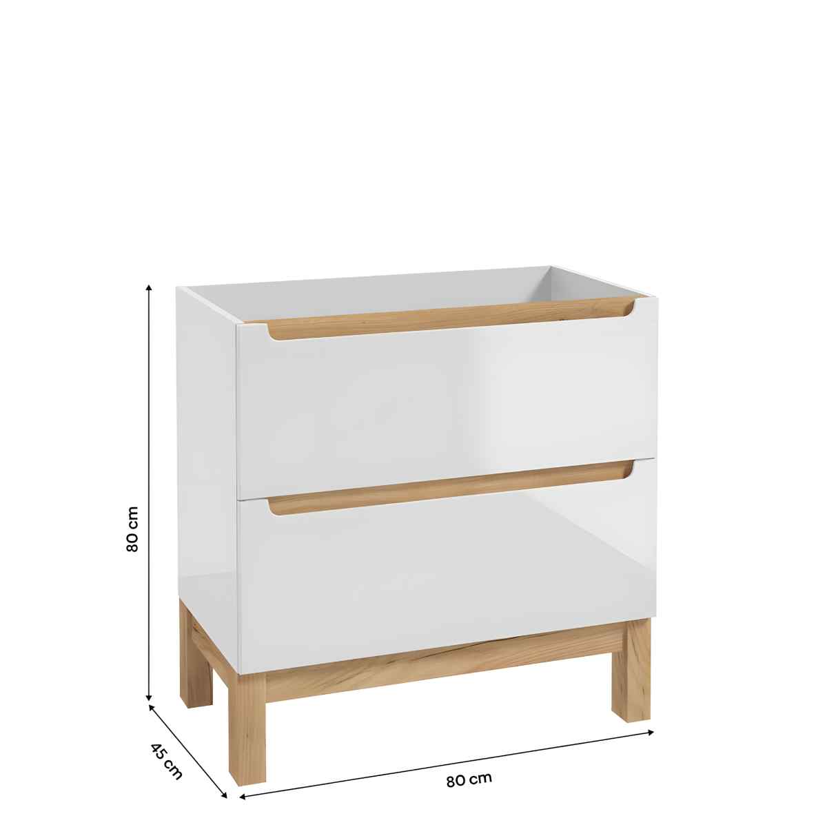 SPACE SYSTEM D80 on 80 cm lai põrandal seisev valamukapp kahe avara sahtliga. Ülemises sahtlis on praktilised vaheseinad, mis aitavad korda hoida. Mõõdud: 80 × 80 × 45 cm (L × K × S). Sahtlid on Soft Close sulgumisega. Käepide on lahendatud freesitud soonega (integreeritud). Jalad on komplektis ja toonis kuldtamm. Sobib nii mööblivalamuga kui ka tasapinnaga + pealt paigaldatava valamuga.