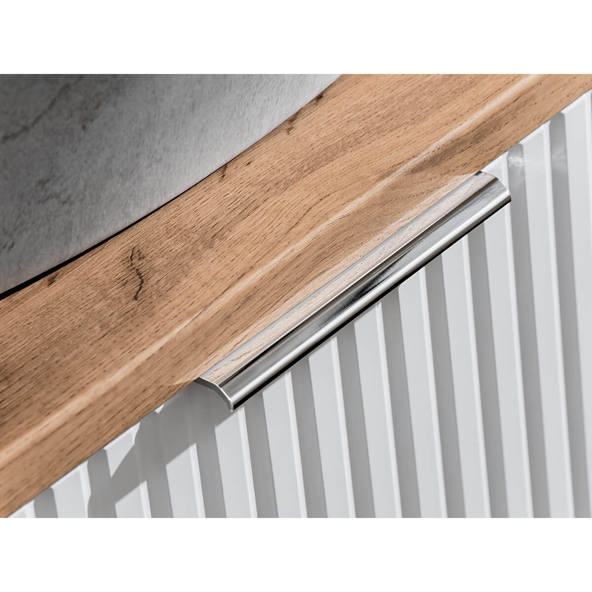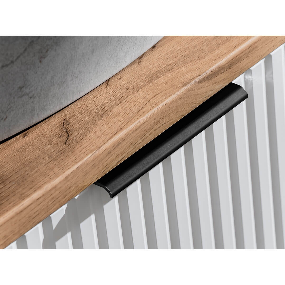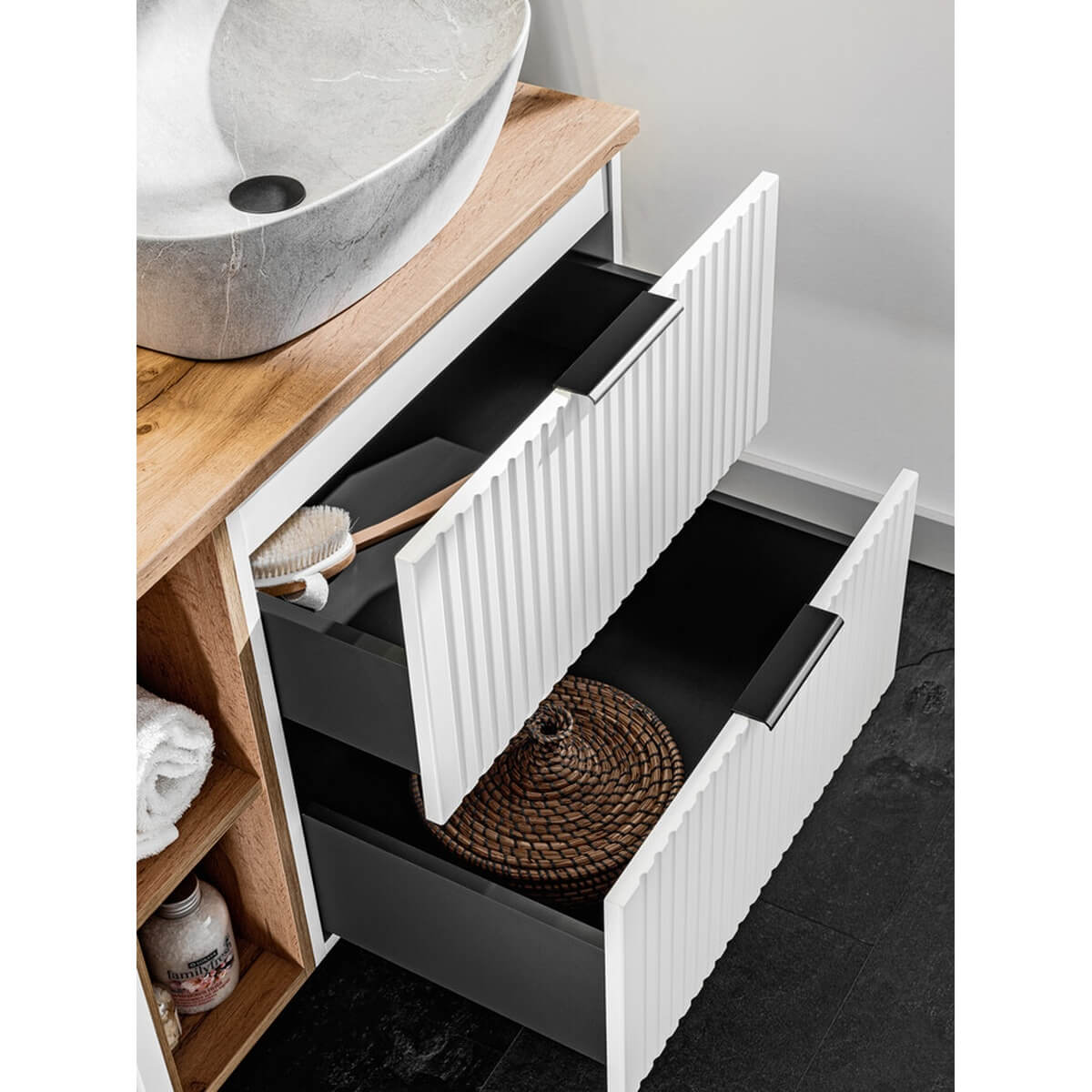 See valamukapp sobib hästi väiksemasse või keskmise suurusega vannituppa. Soontega esipaneelid lisavad visuaalset huvi ja muudavad kapi eriliseks. Vaikselt sulguvad sahtlid tagavad mugava kasutuse.