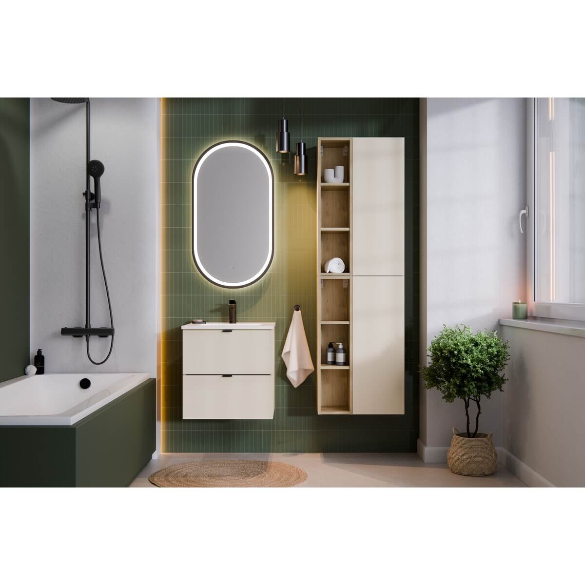 See kompaktne valamukapp sobib hästi väiksemasse vannituppa, kus iga sentimeeter on oluline. Kašmiir matt viimistlus on kergesti hooldatav ja sobib paljude vannitoastiilidega.