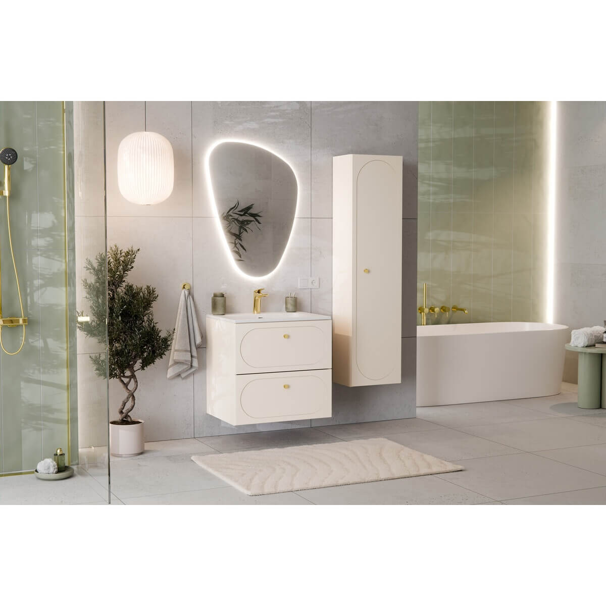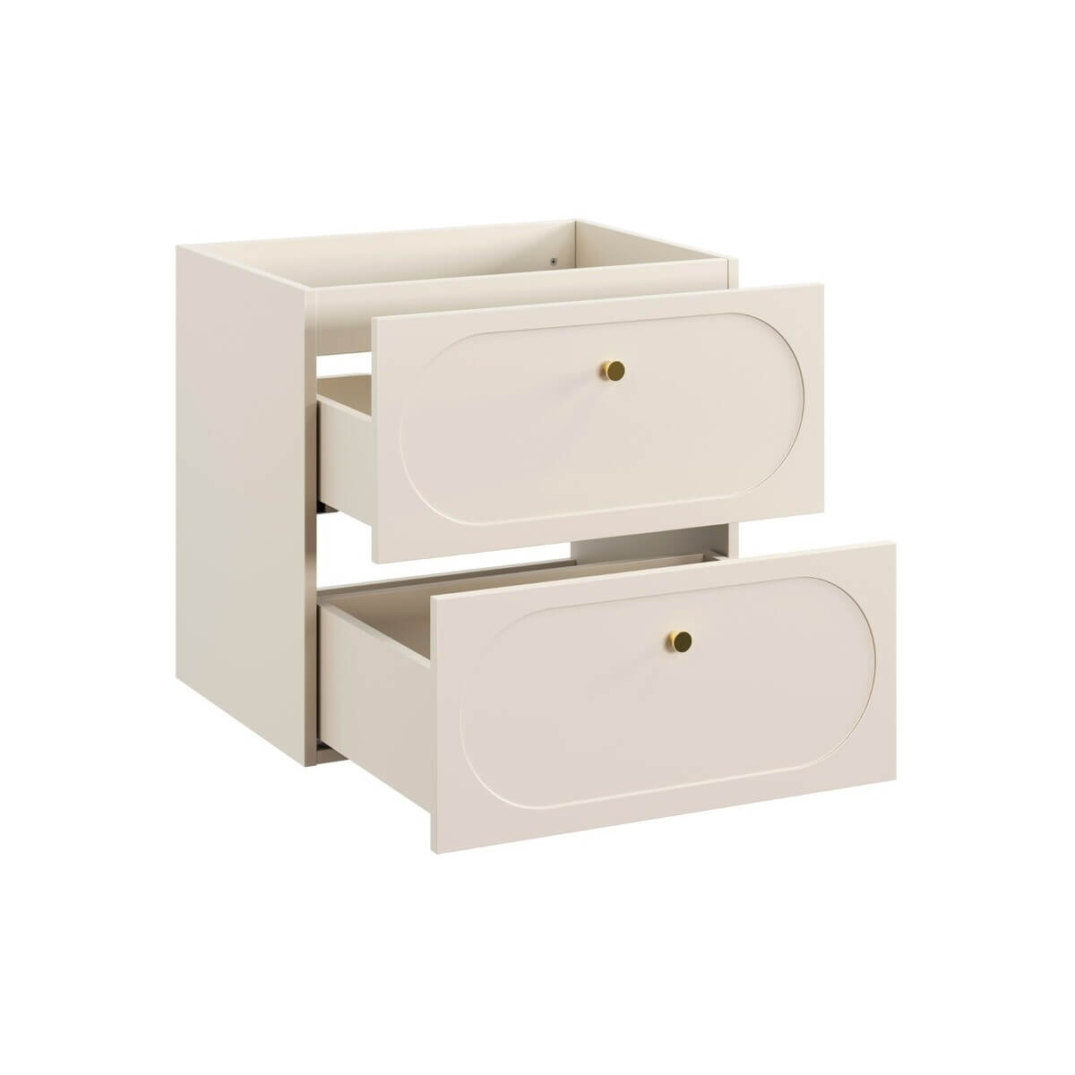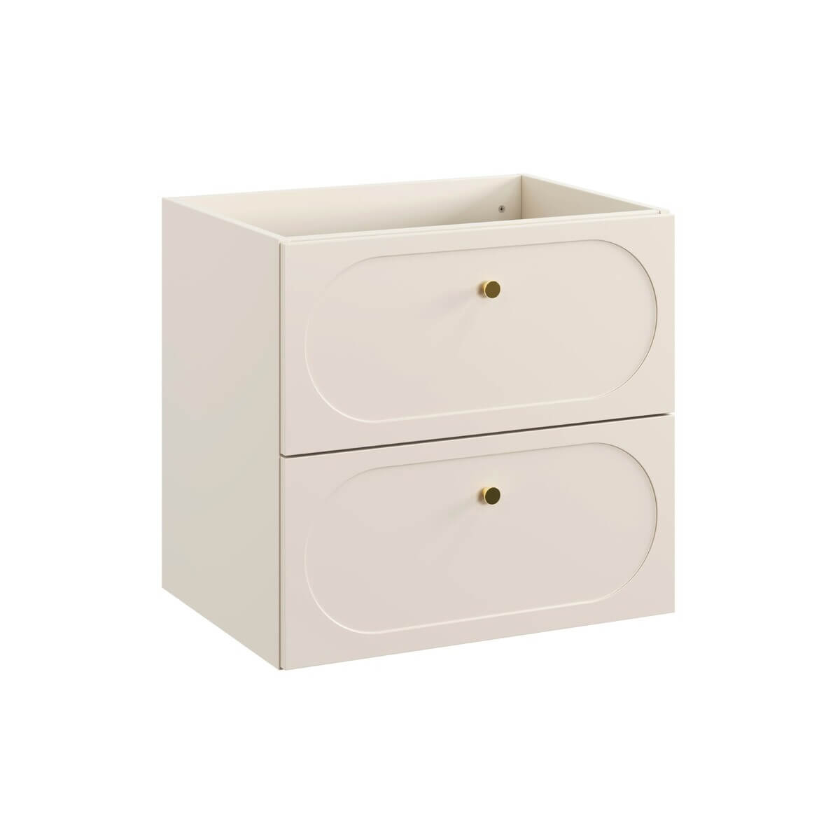 60 cm laiune kahe sahtliga valamukapp Donna Sand kollektsioonist on kaasaegne tõlgendus klassikalisest stiilist, mis on inspireeritud peenusest. Õrnad reljeefse soontega esipaneelid annavad kollektsioonile ainulaadse iseloomu ja kerguse. Kasutatud beež liivakarva dekoor on variatsioon kašmiirvärvidest, mis on vallutanud sisustustrendid, tuues interjööri soojust ja harmooniat. Kogu välimuse täiendavad kuldsed metallist käepidemed, mis rõhutavad elegantsi ja annavad viimistlusele väärikust.