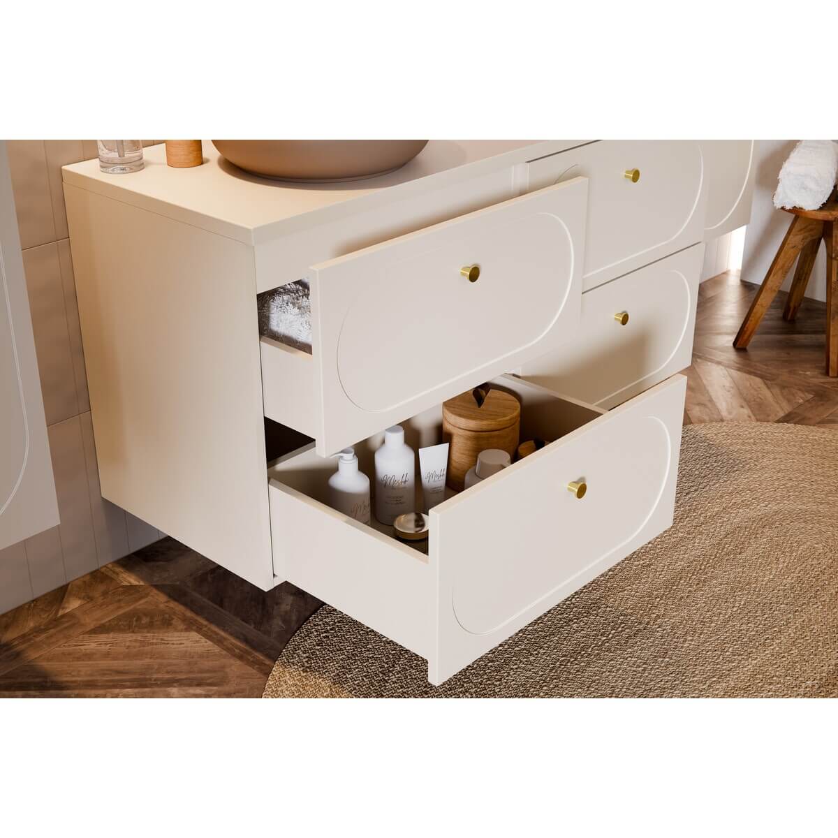 Kaks sahtlit pakuvad palju ruumi vannitoatarvikute hoiustamiseks, hoides ruumi korras. Pehmelt sulguv süsteem suurendab veelgi kasutusmugavust, rõhutades tähelepanu detailidele igapäevases kasutuses. Mööbel on valmistatud vastupidavatest materjalidest nagu MDF-plaat ja lamineeritud plaat, mis tagavad esteetilise välimuse aastateks.