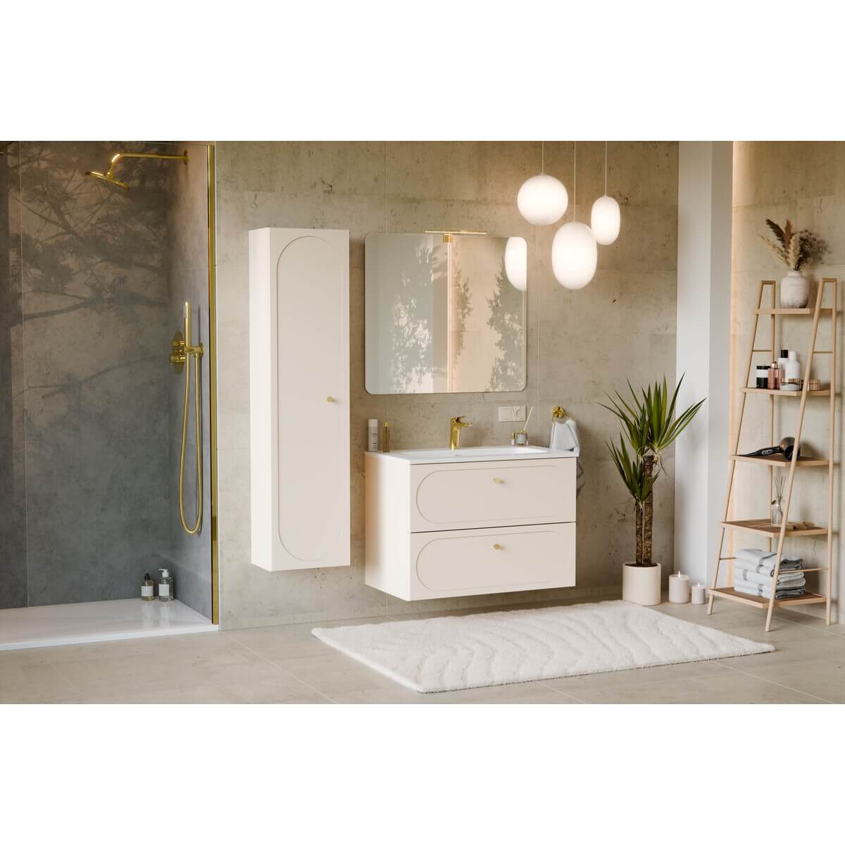 See stiilne valamukapp sobib hästi nii väiksemasse kui ka suuremasse vannituppa. Beež toon on rahustav ja loob vannitoas hubase atmosfääri. Kuldset värvi käepidemed lisavad luksusliku aktsendi.
