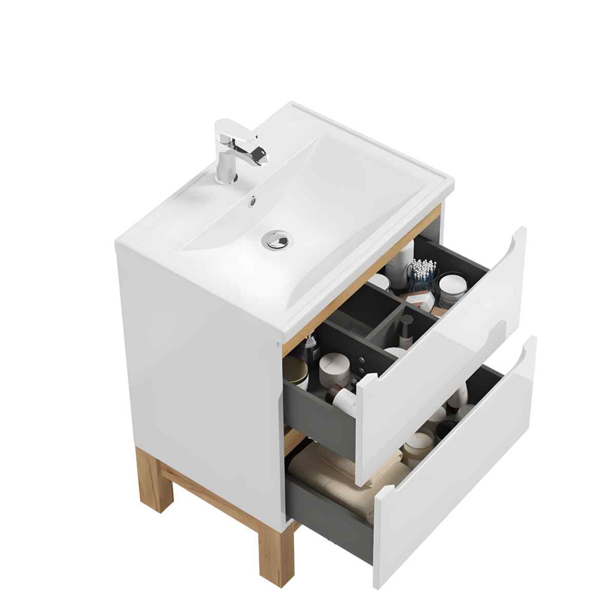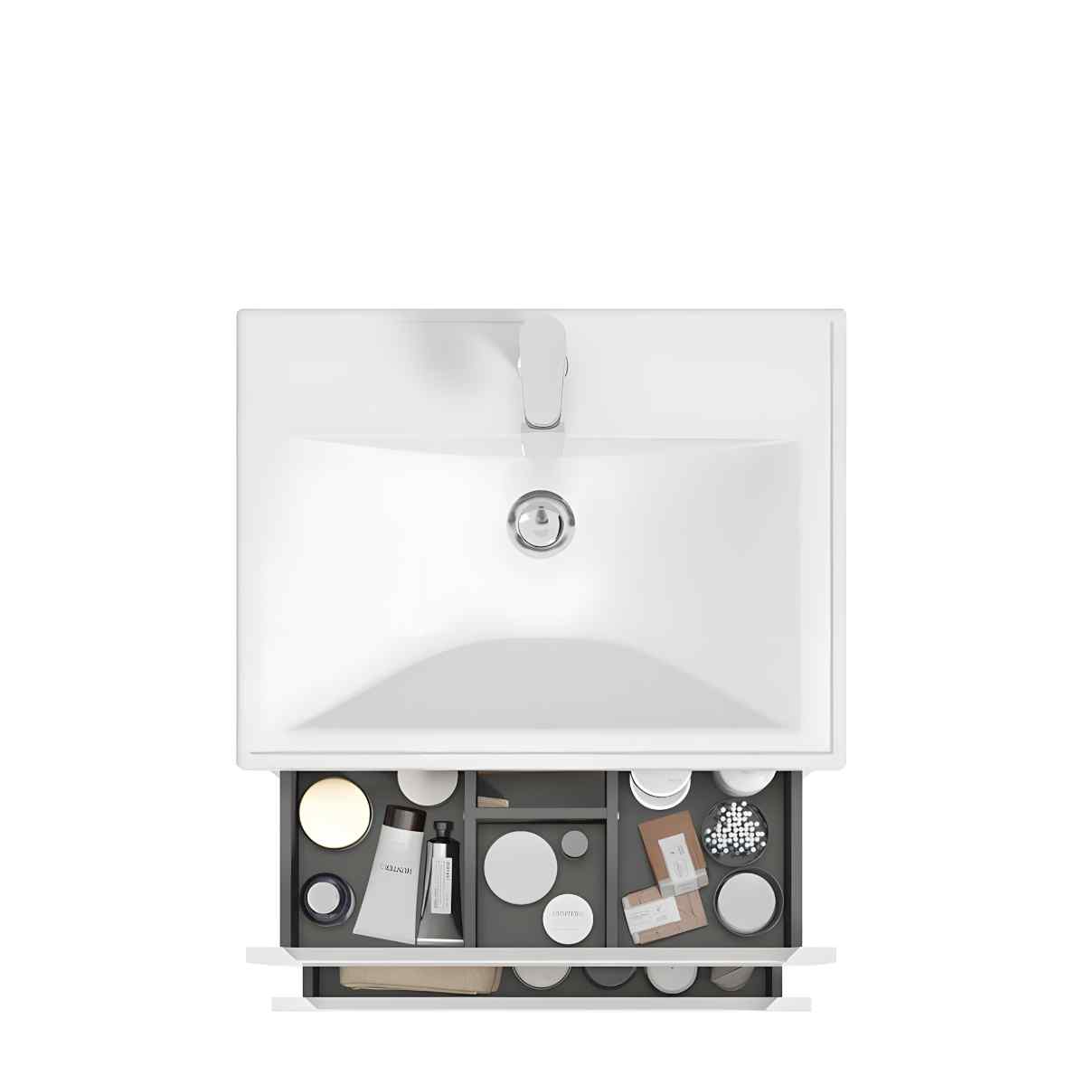 SPACE SYSTEM D60 on 60 cm lai põrandal seisev valamukapp kahe avara sahtliga. Ülemises sahtlis on praktilised vaheseinad, mis aitavad korda hoida. Mõõdud: 60 × 80 × 45 cm (L × K × S). Sahtlid on Soft Close sulgumisega. Käepide on lahendatud freesitud soonega (integreeritud). Jalad on komplektis ja toonis kuldtamm. Sobib nii mööblivalamuga kui ka tasapinnaga + pealt paigaldatava valamuga.