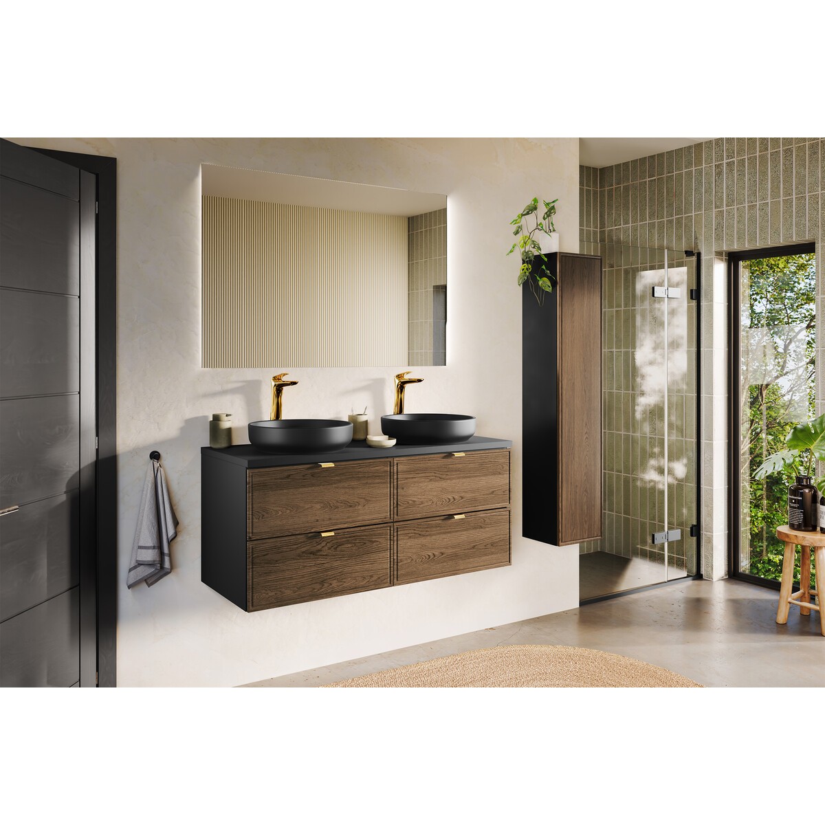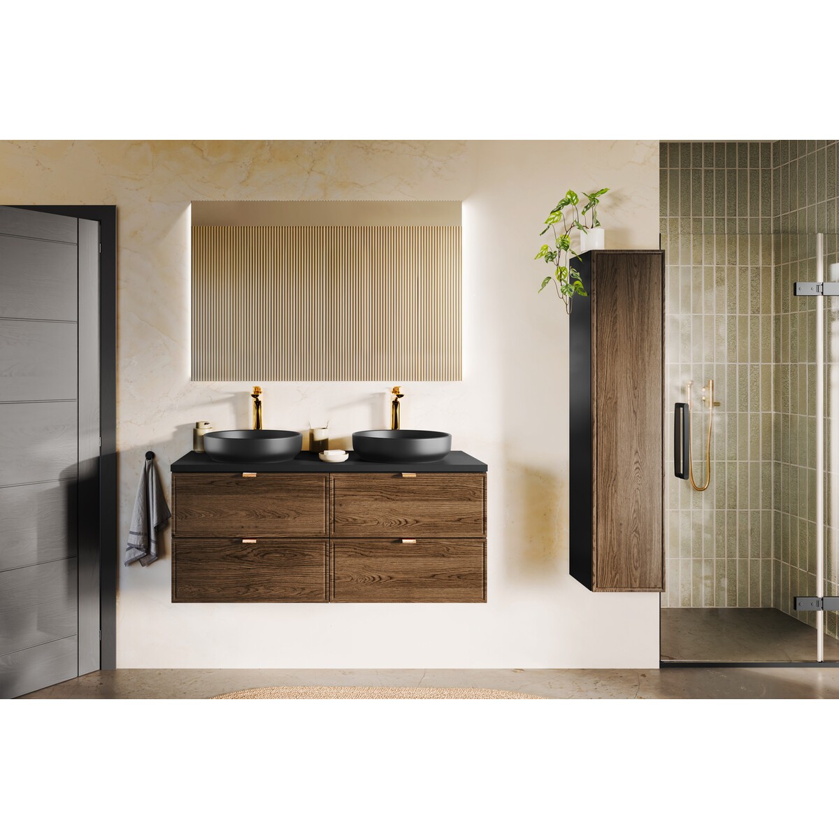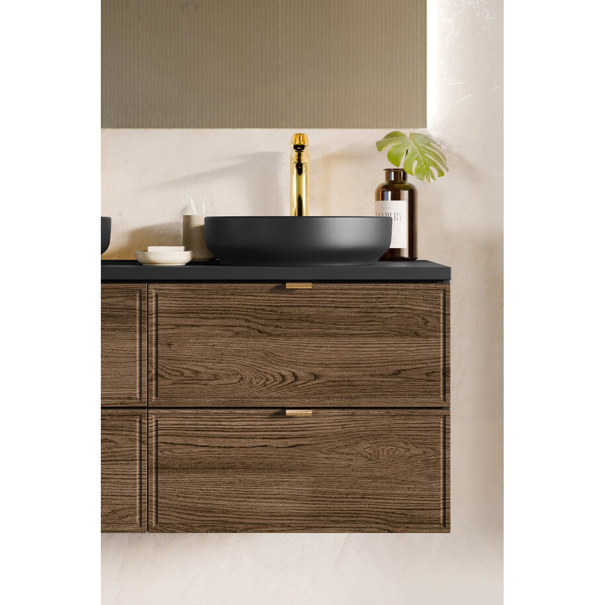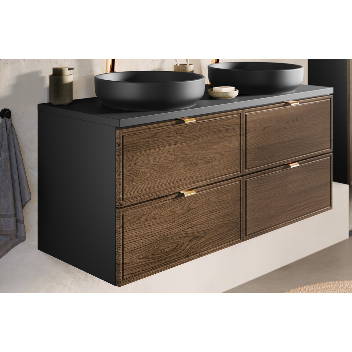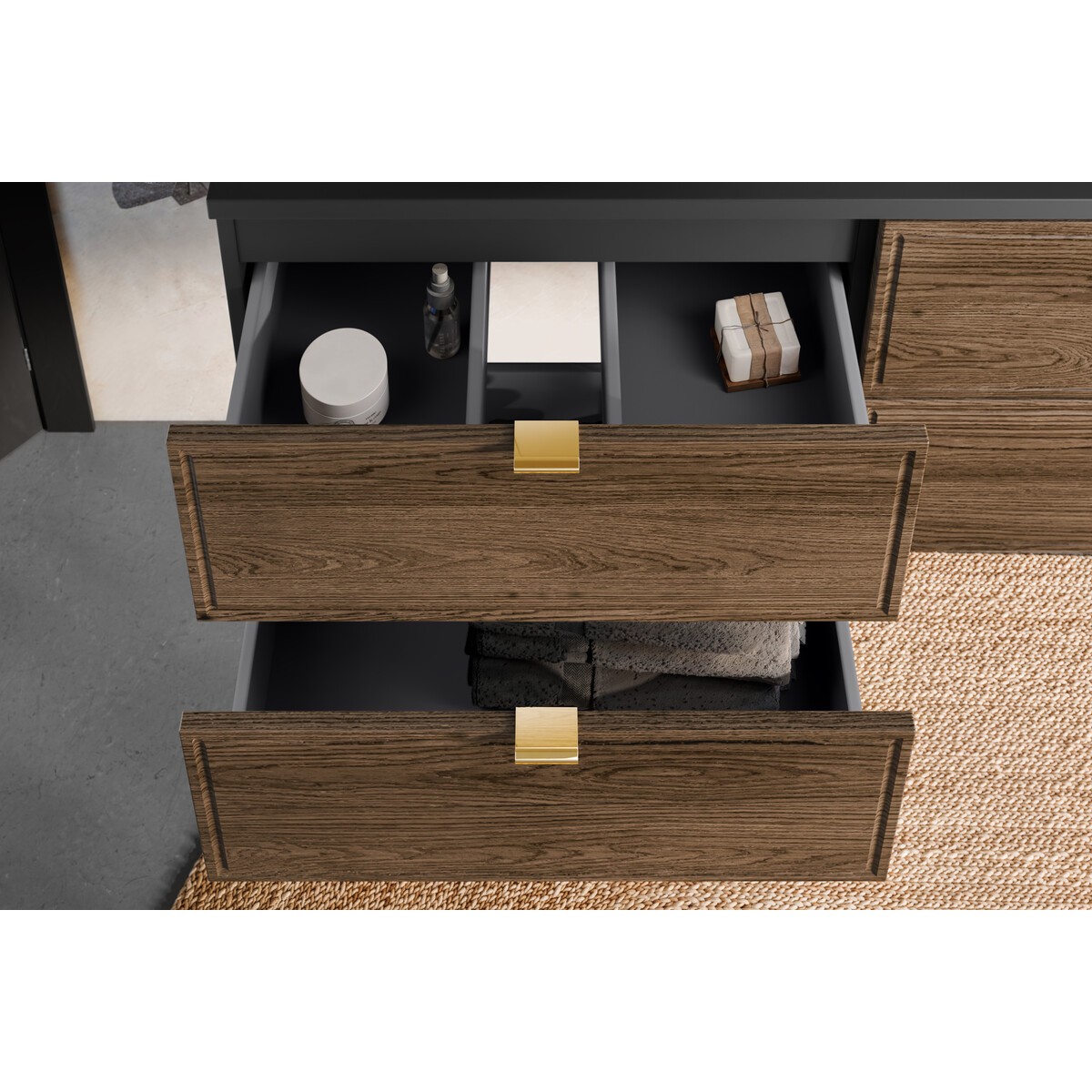 60 cm laiune kahe sahtliga valamukapp Talia Casella kollektsioonist ühendab klassikalise elegantsi modernse stiiliga. Iseloomulikud soontega esipaneelid tõmbavad tähelepanu oma ajatu vormiga ning Casella tamme dekoor jäljendab suurepäraselt puidu loomulikku ilu, tuues ruumi soojust ja harmooniat. Mööbli karkass sügavas mustas matis annab kollektsioonile väljendusrikkust ja kaasaegset iseloomu. Kollektsioon pakub ka võimalust isikupärastada valamukappe tänu kolmele komplektis olevale käepideme värvile – kuldne läige, kroomläige ja must matt, mis võimaldab mööblit kohandada vastavalt individuaalsetele eelistustele.