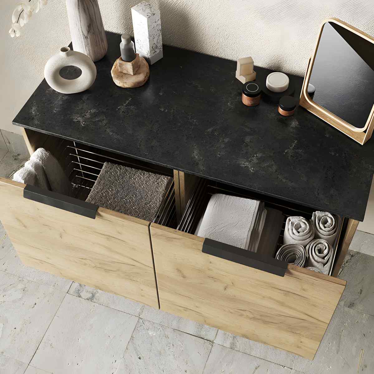 ✓ Integreeritud väljatõmmatav metallpesukorv — nutikas koht rätikutele või mustale pesule
